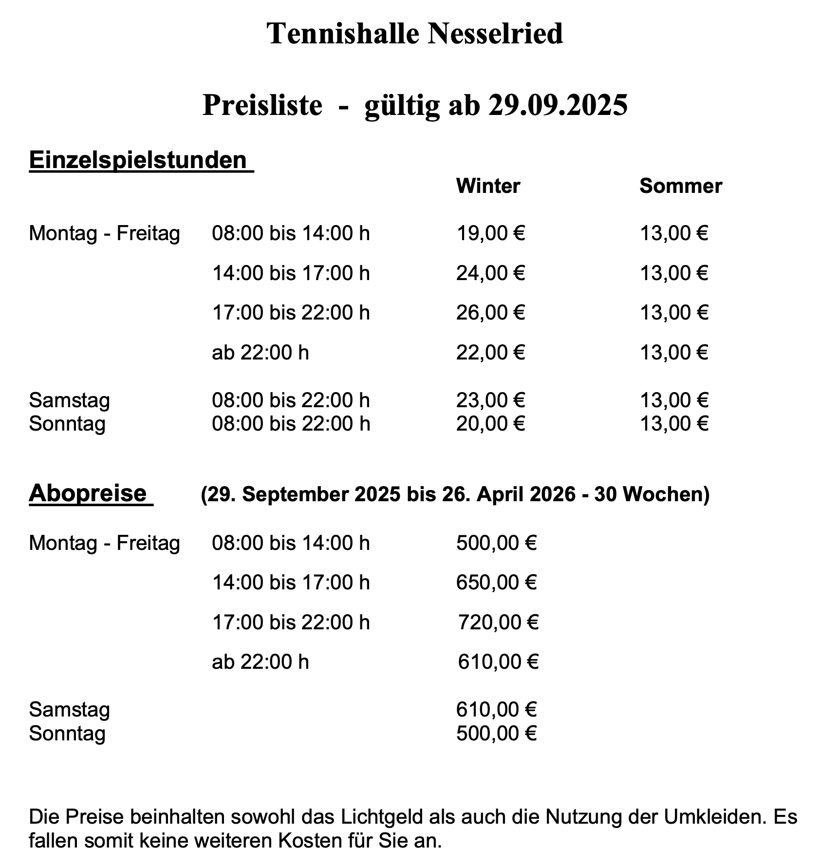 Die Buchung von wöchentlichen Terminen (Tennisabos) erfolgt nicht über das Buchungstool. Ihre Aboanfrage senden Sie bitte führzeitig vor der Wintersaison über das Kontaktformular am Ende der Seite.